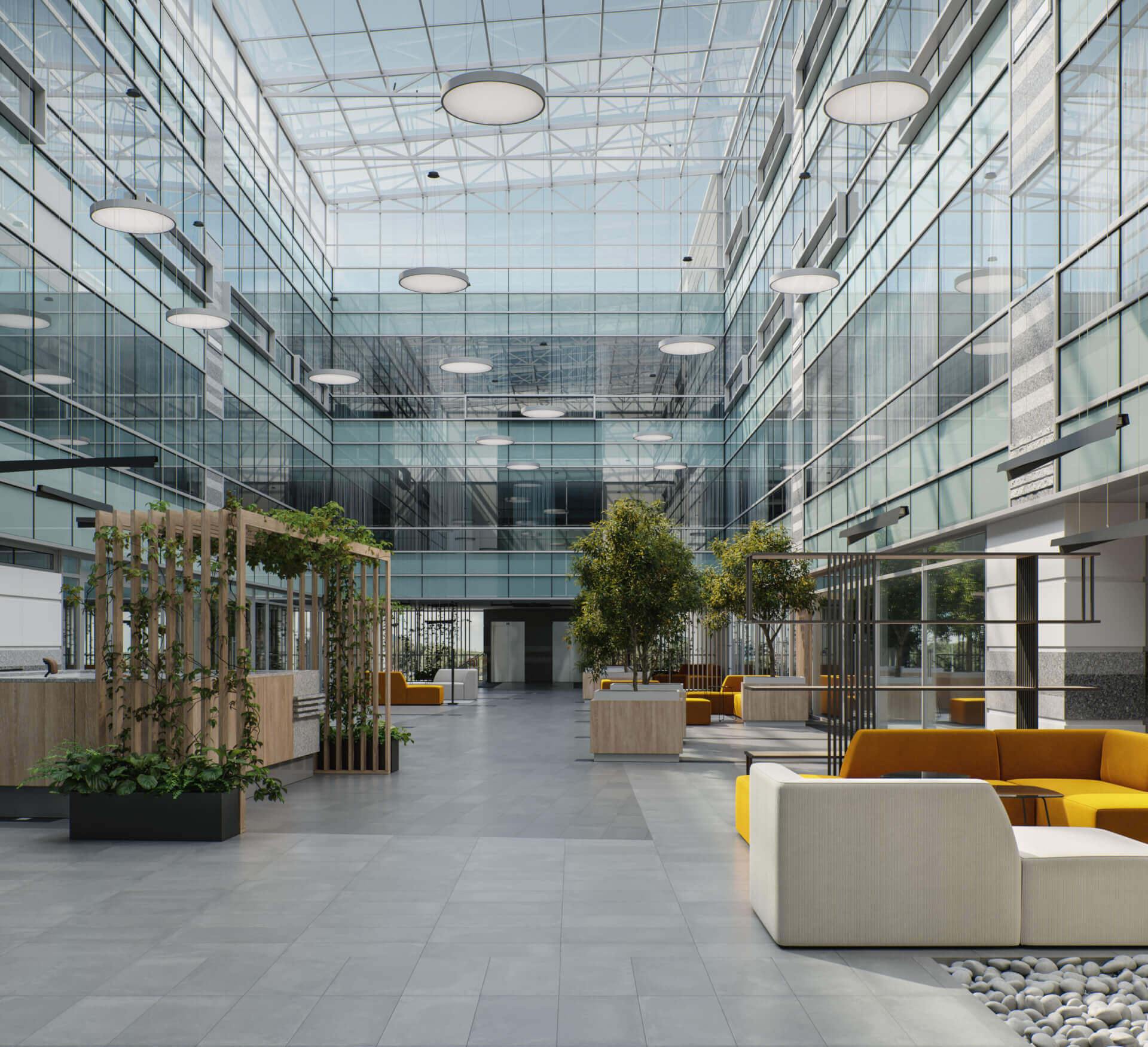 Bliskość natury podnosi efektywność pracy, uprzyjemnia czas spędzony w biurze i poprawia nastrój – zarówno pracownikom jak i klientom. Zróżnicowana roślinność i wygodne meble pozwalają na chwilę wytchnienia w cieniu drzew.